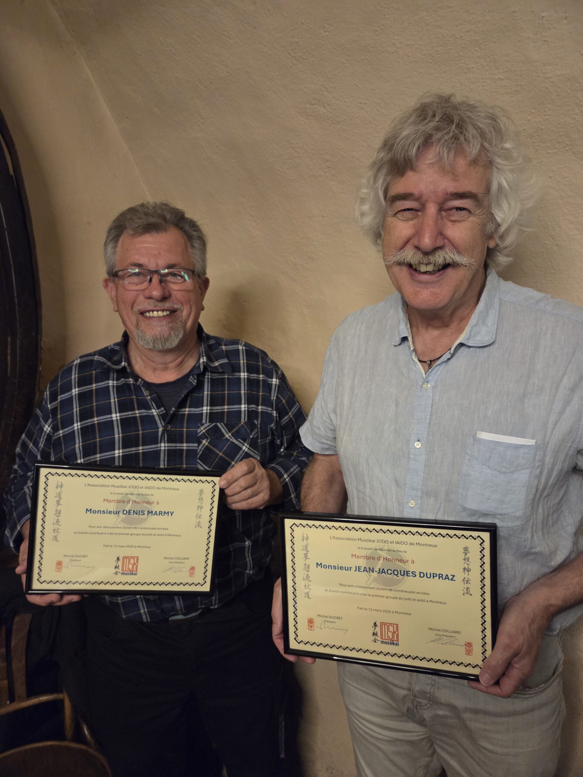 Jean-Jacques Dupraz et Denis Marmy, le 14.03.2025, pour leur dévouement durant de nombreuses années et d’avoir contribué a créé le premier groupe de Jodô et de Iaidô à Montreux.